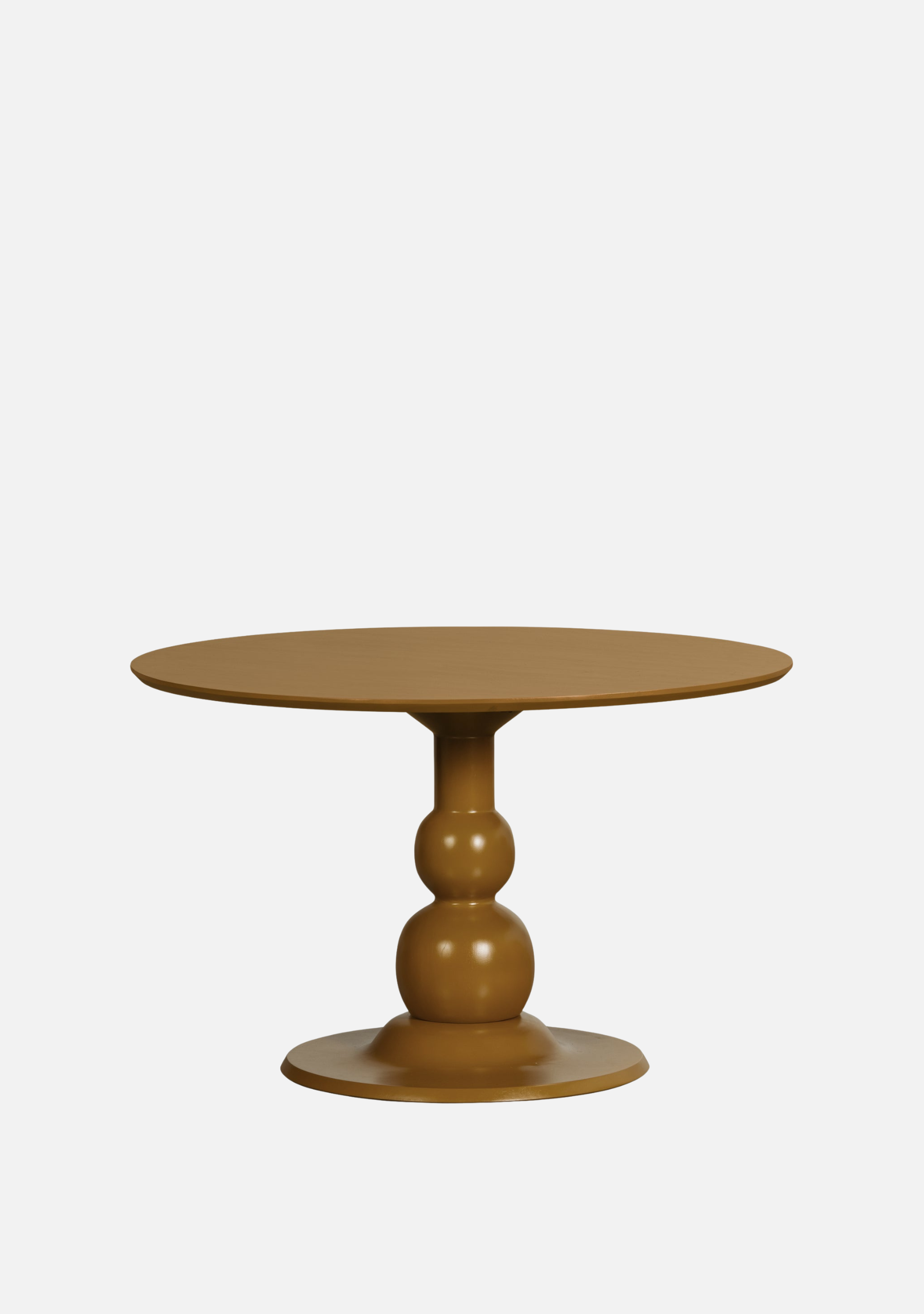 Eleganter Esstisch aus Mangoholz in Honiggelb. Skulpturaler Fuß, warmer Farbton und zeitlose Handwerkskunst.