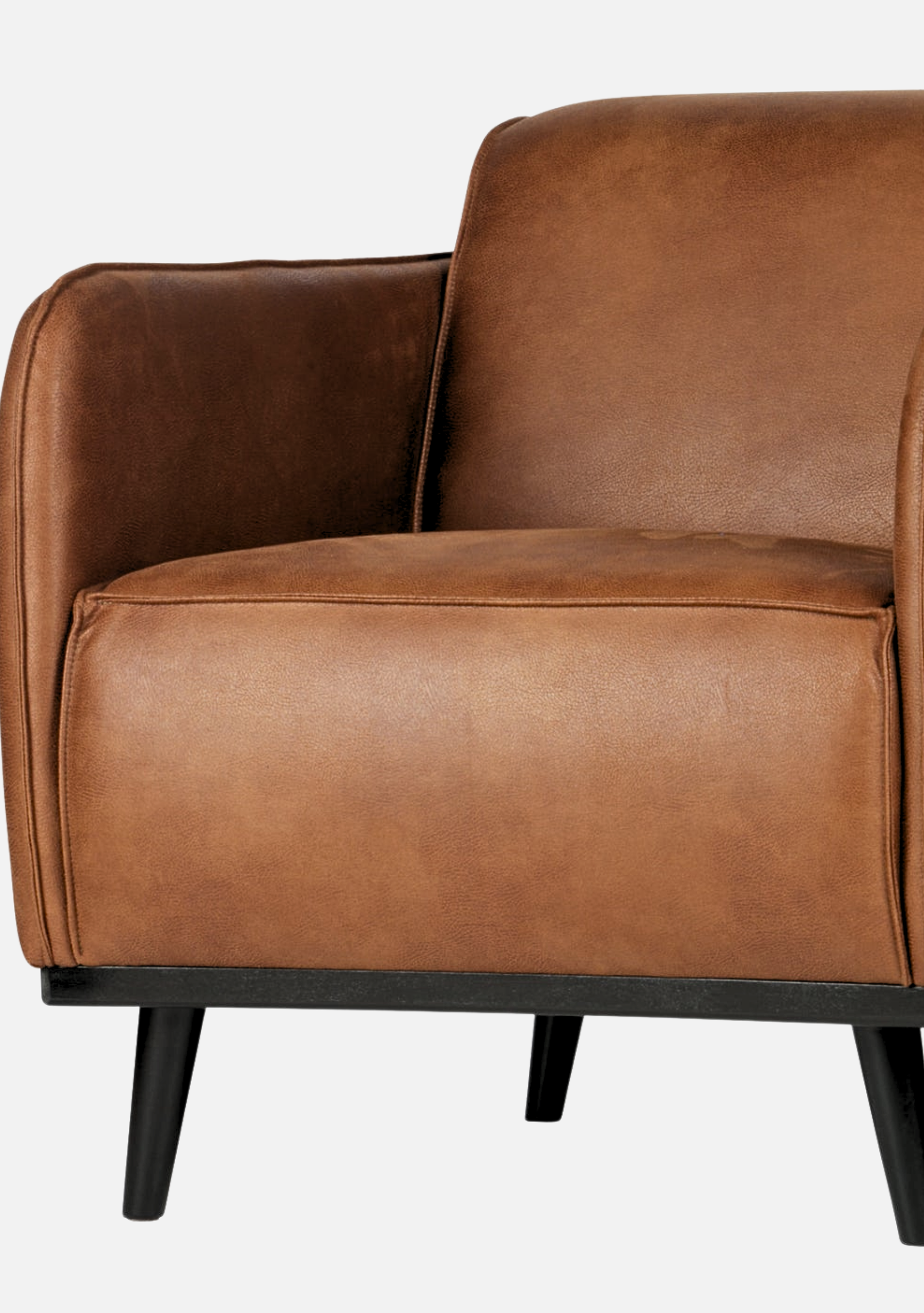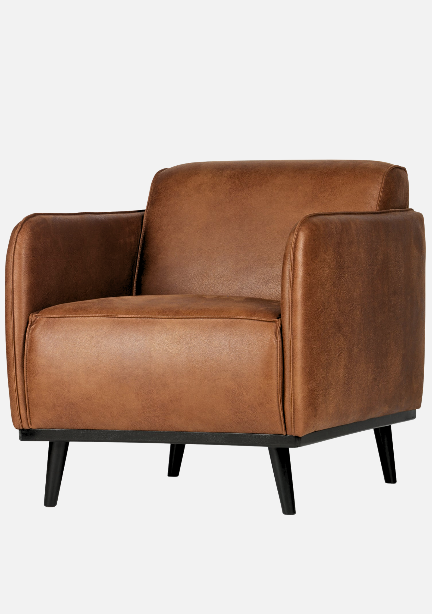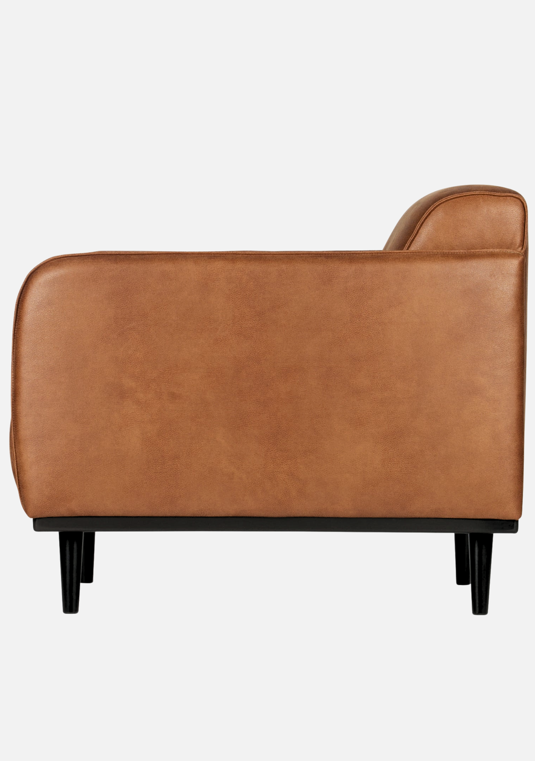 Sessel aus cognacfarbenem Öko-Leder mit weicher, matter Oberfläche, eleganter Silhouette und Beinen aus massiver Birke. Raffinierter Komfort für zeitlose Interieurs.