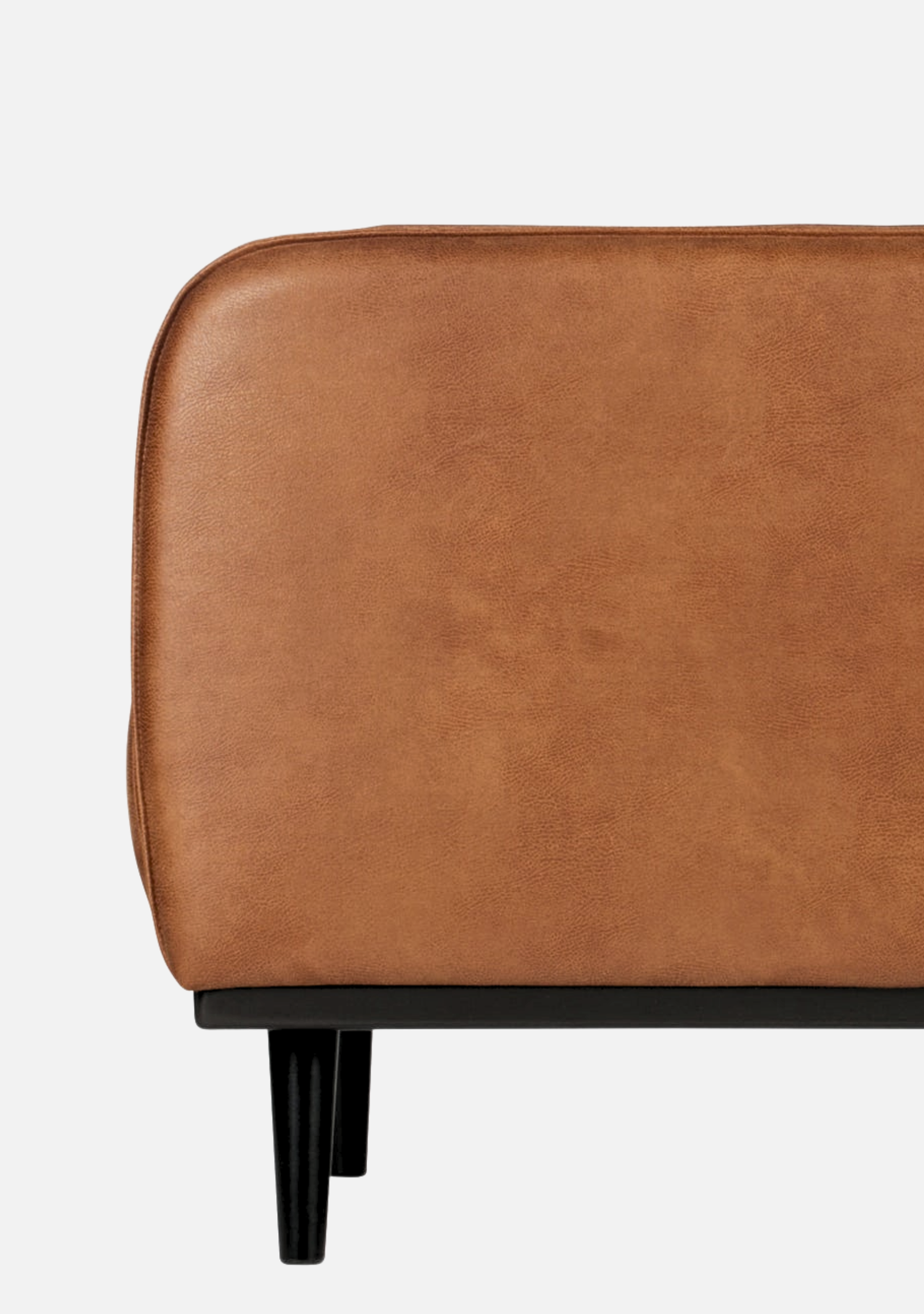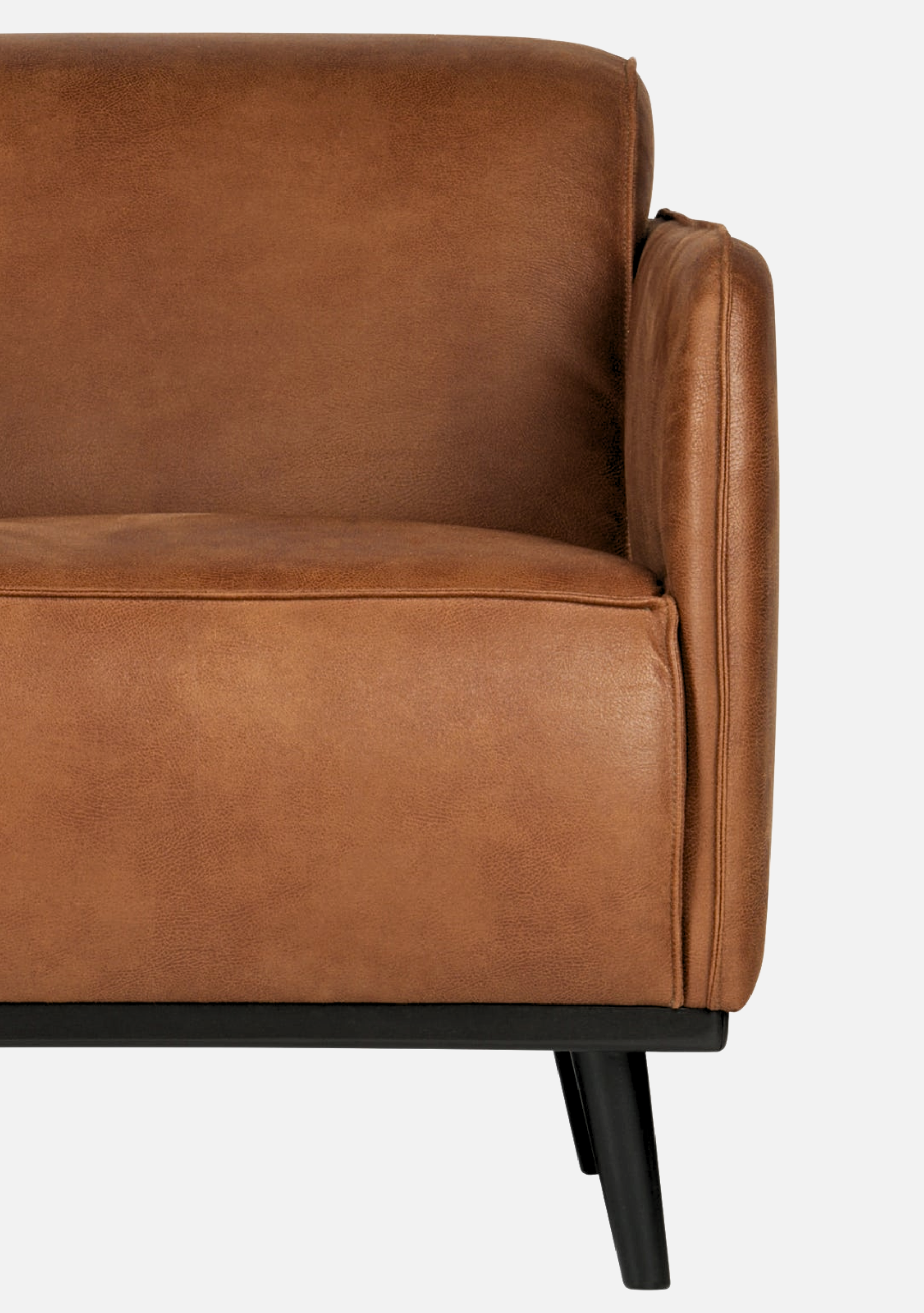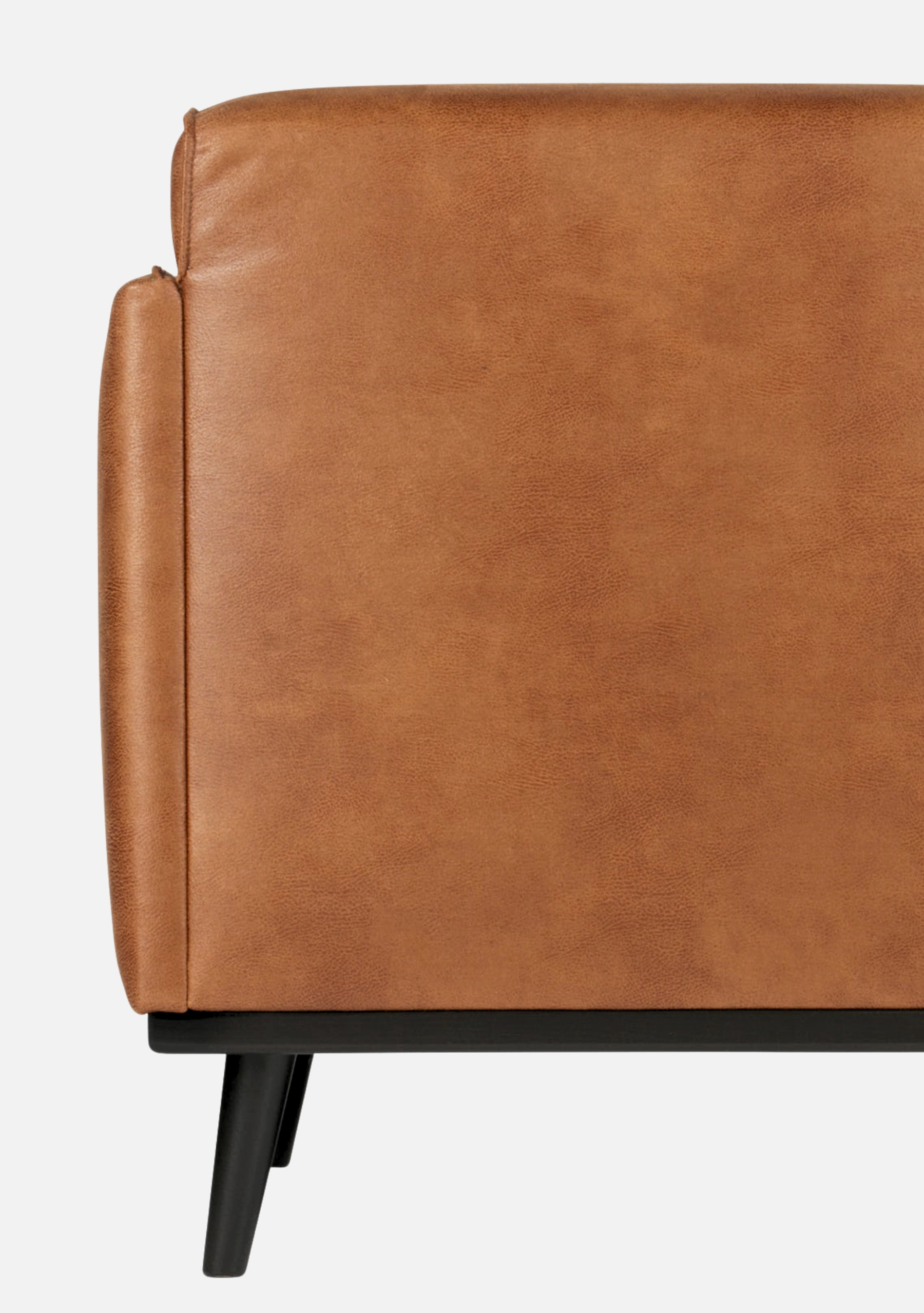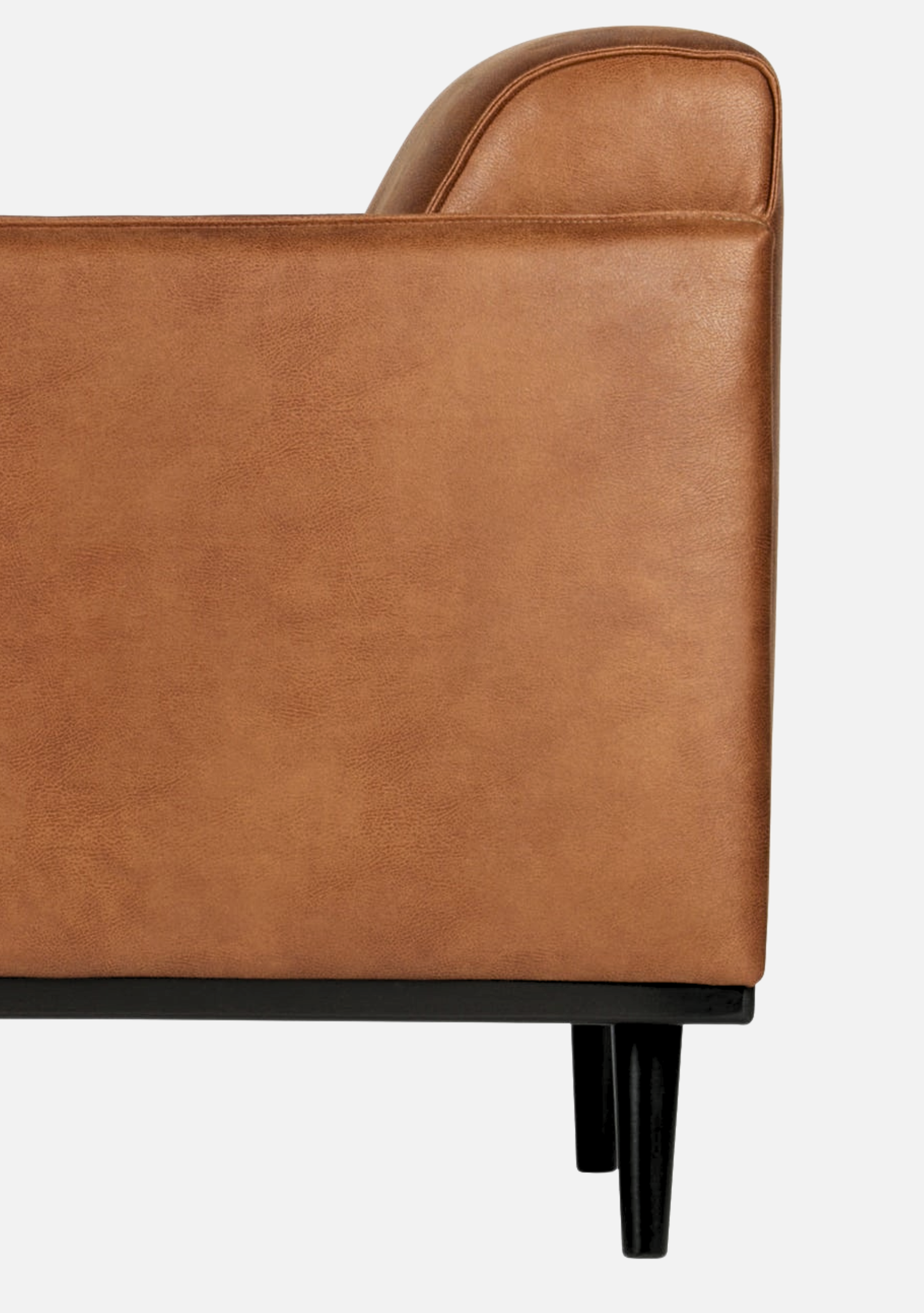 Sessel aus cognacfarbenem Öko-Leder mit weicher, matter Oberfläche, eleganter Silhouette und Beinen aus massiver Birke. Raffinierter Komfort für zeitlose Interieurs.