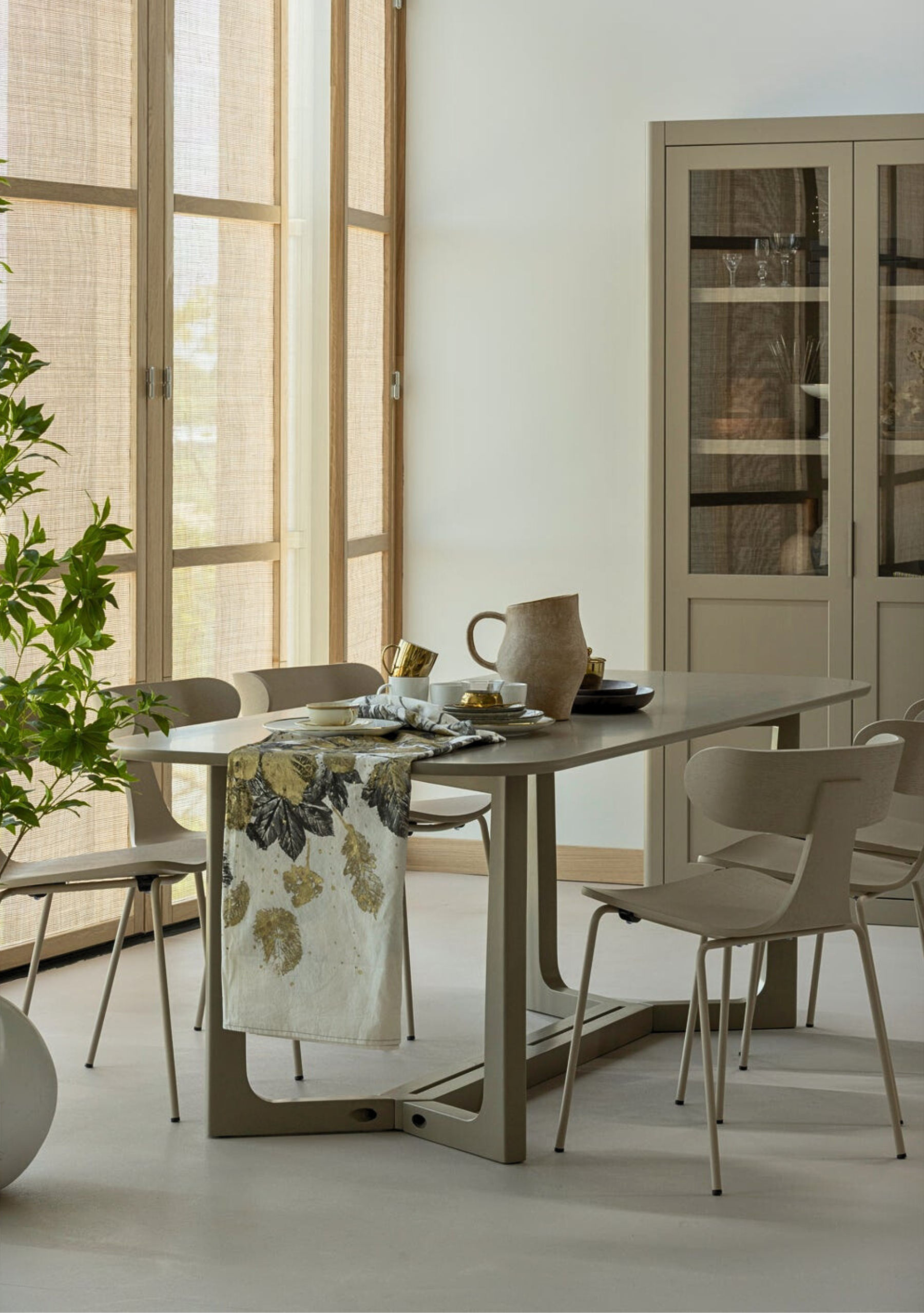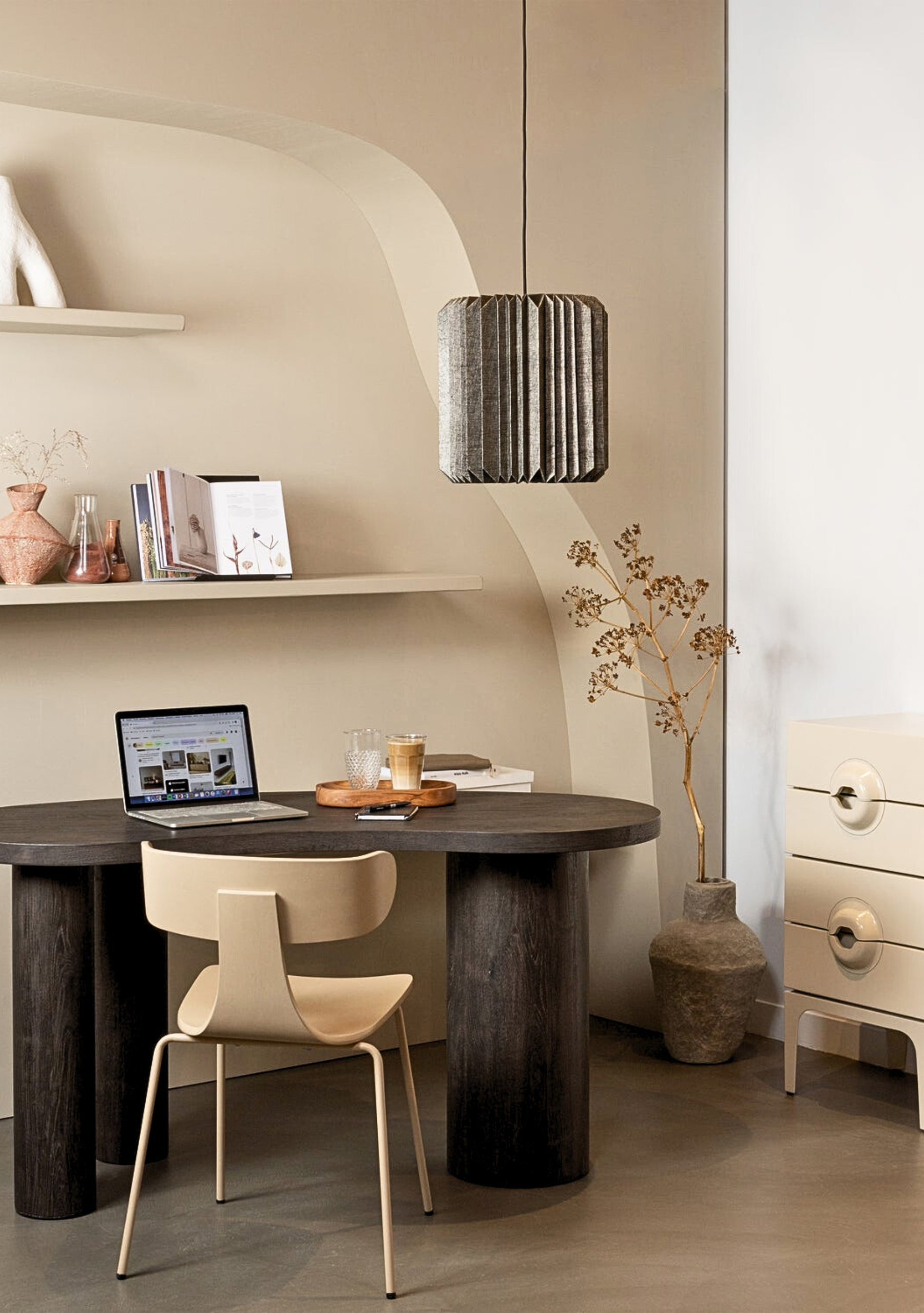 Crafted from ash veneer and a sand-toned steel base, it offers a perfect balance between natural warmth and minimalist geometry.