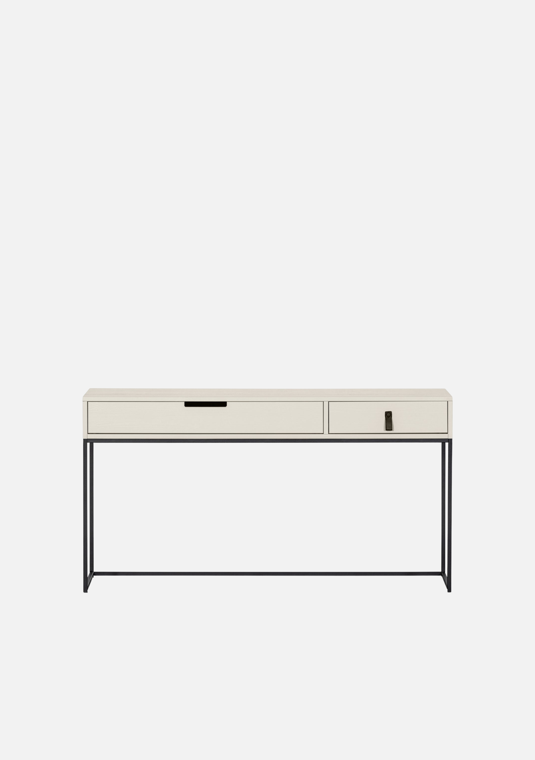 Crafted from FSC®-certified pine wood in a soft Dust tone, it rests on a minimalist black metal frame that adds lightness and modern character. With dimensions of 74 cm in height, 140 cm in width, and 40 cm in depth, this piece offers generous storage space through two drawers — one with a sleek cut-out handle and another with a leather detail.
