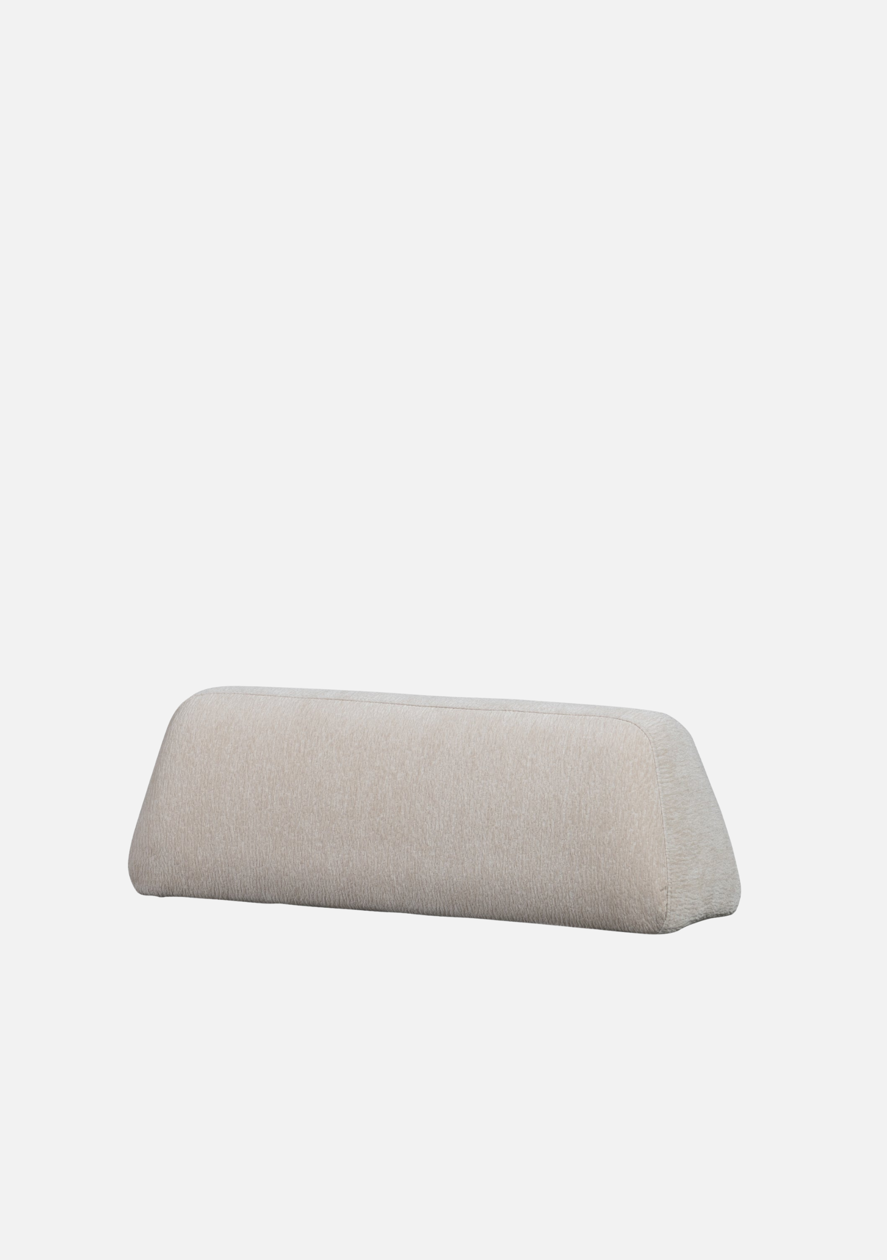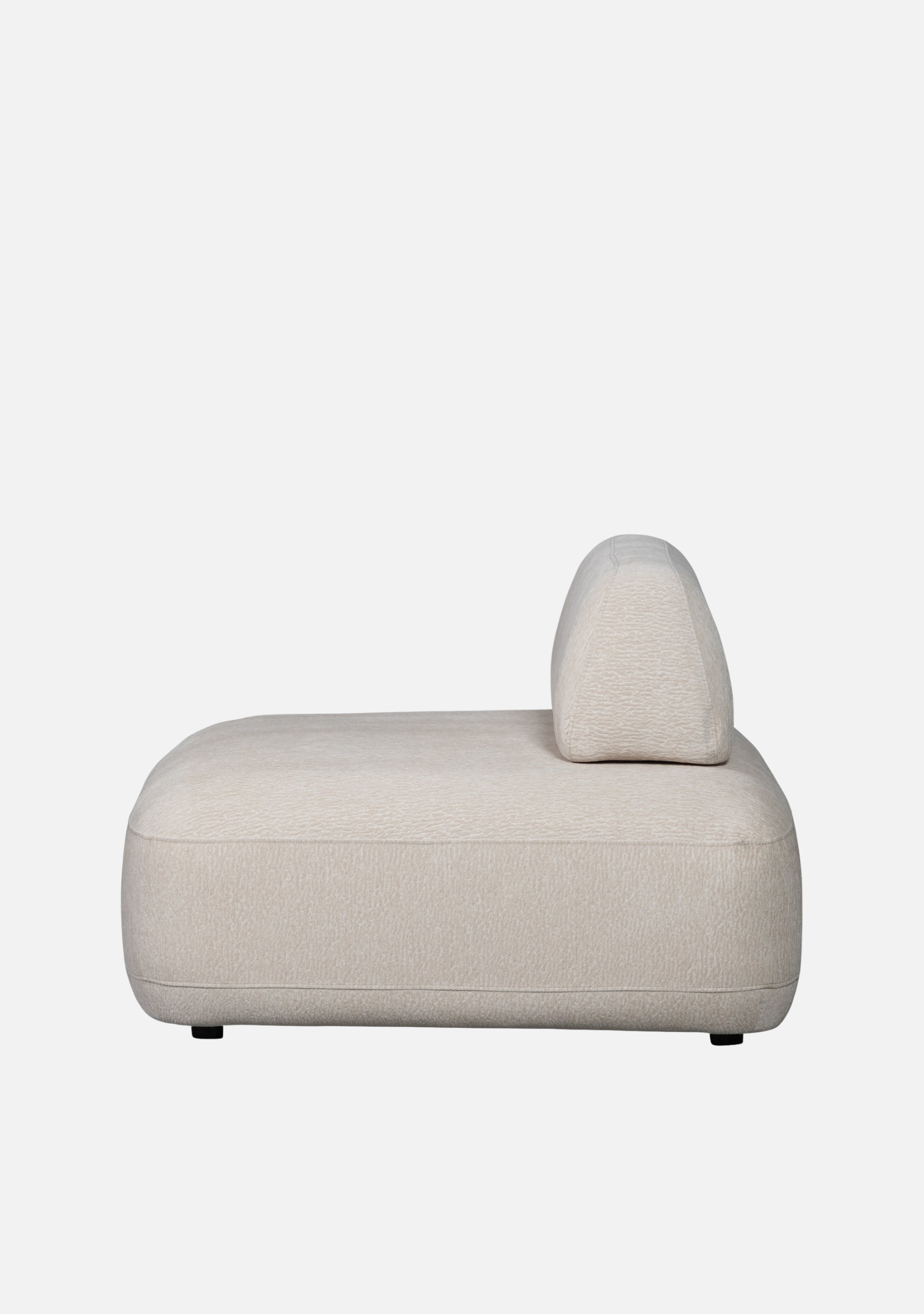 Modular armchair in sand textured fabric with movable backrest. Relaxed form, soft touch, and sculptural comfort.