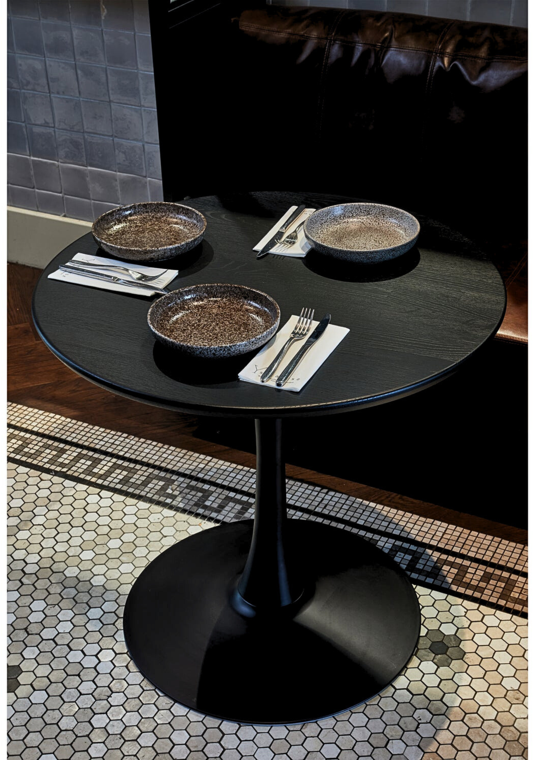 Round bistro table in deep black oak, 80×74 cm. Minimalist pedestal design with FSC-certified wood. Round Table – Black Oak 80×74 cm