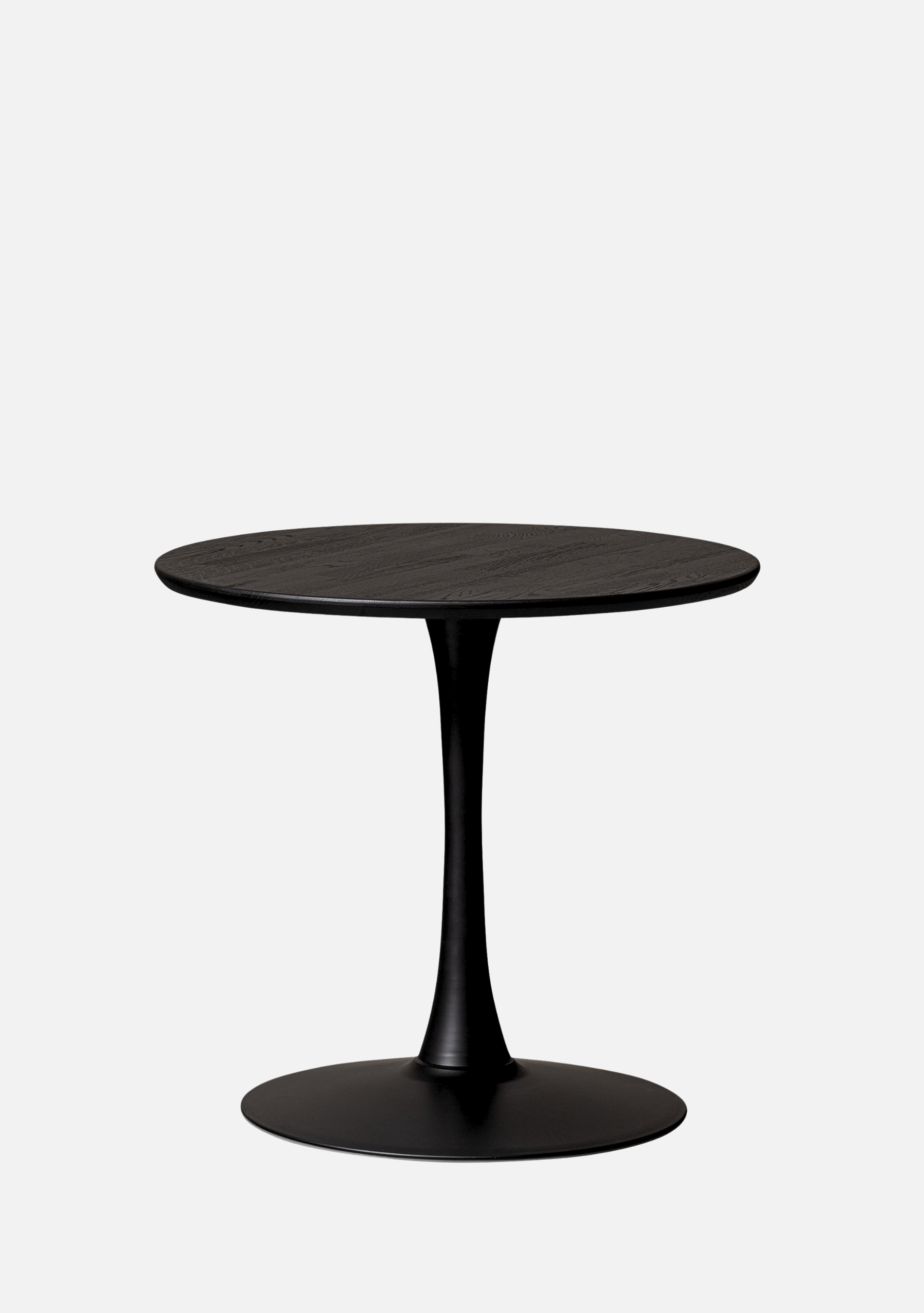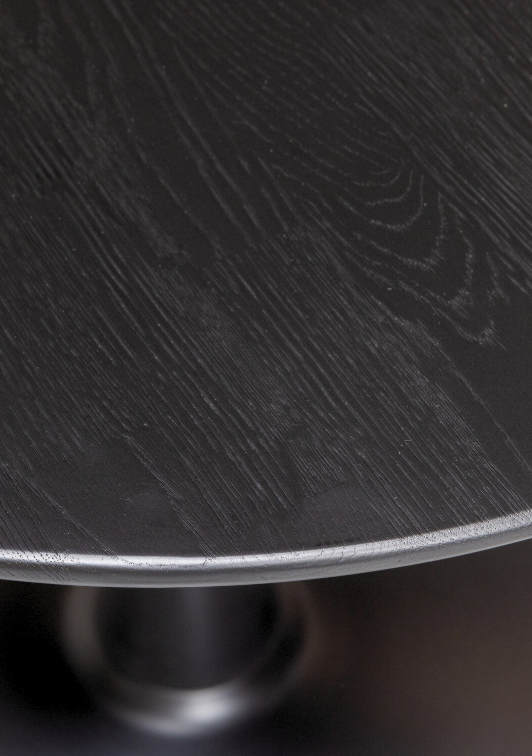 Crafted from FSC®-certified oak wood, it features a smooth circular tabletop with a deep black water-based stain that reveals the wood’s natural grain. The elegant pedestal base, made of metal with a matte powder-coated finish, adds sculptural balance and timeless appeal.