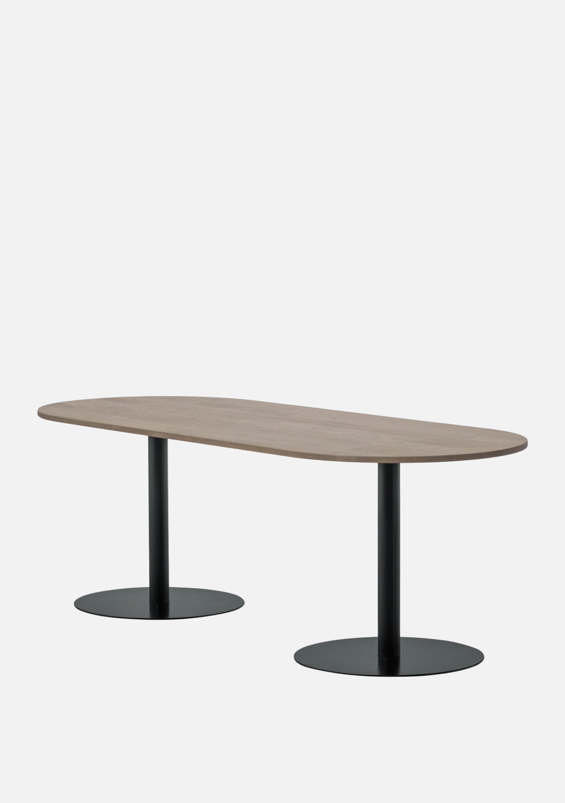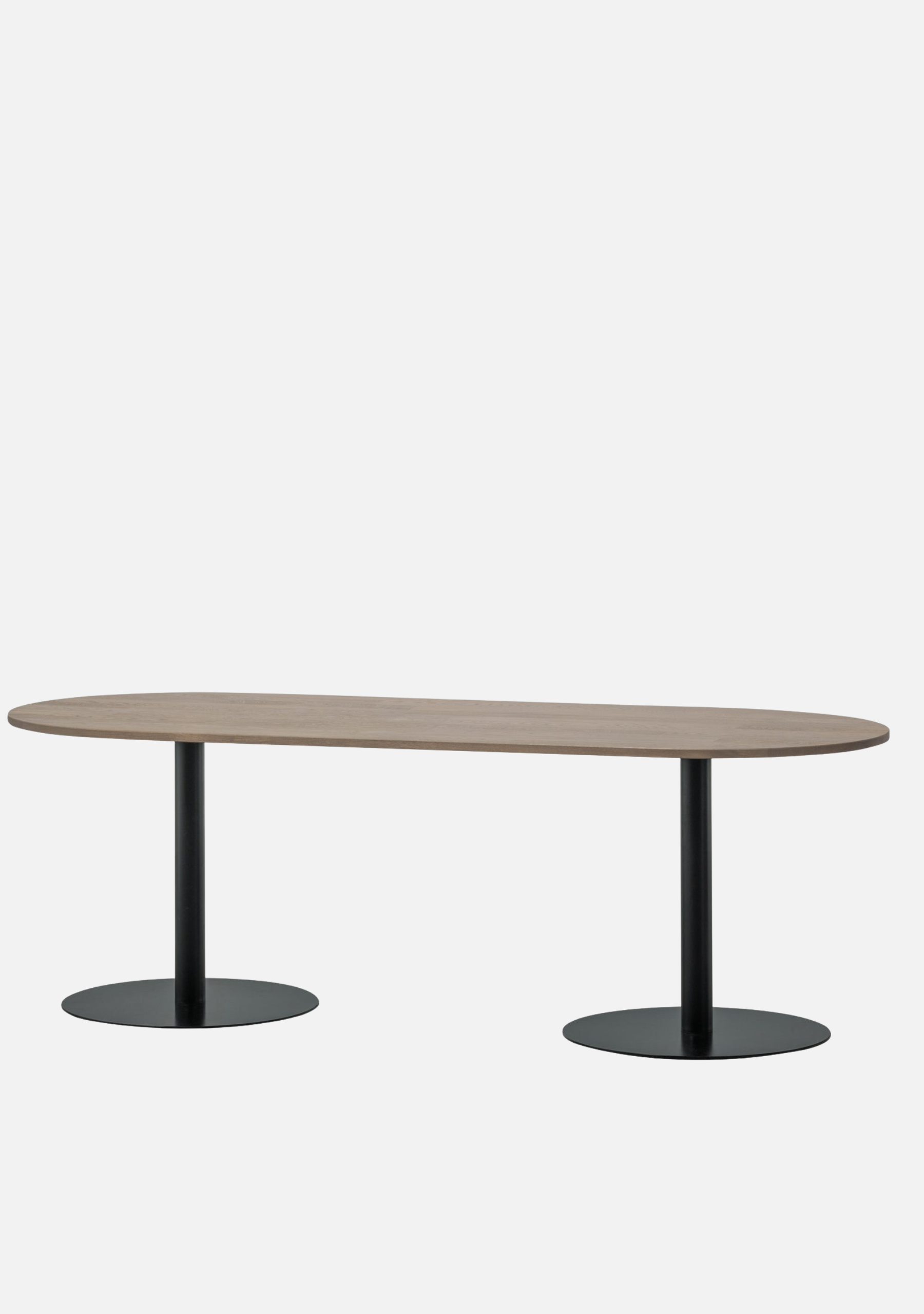 Oval dining table in FSC® oak, pebble grey finish with black metal base. Elegant and timeless design.