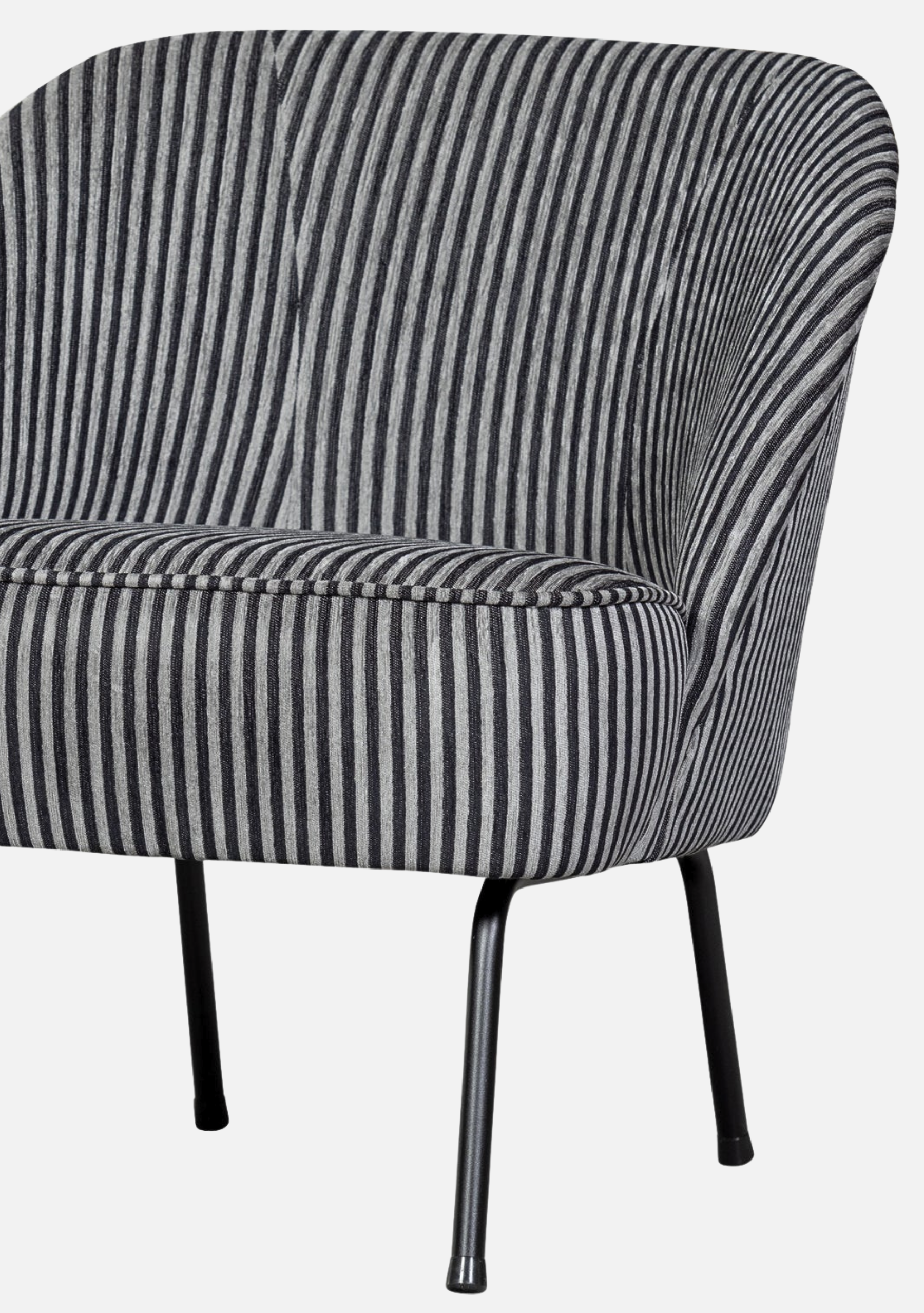 The Vogue Armchair in black-grey woven stripes redefines timeless sophistication.