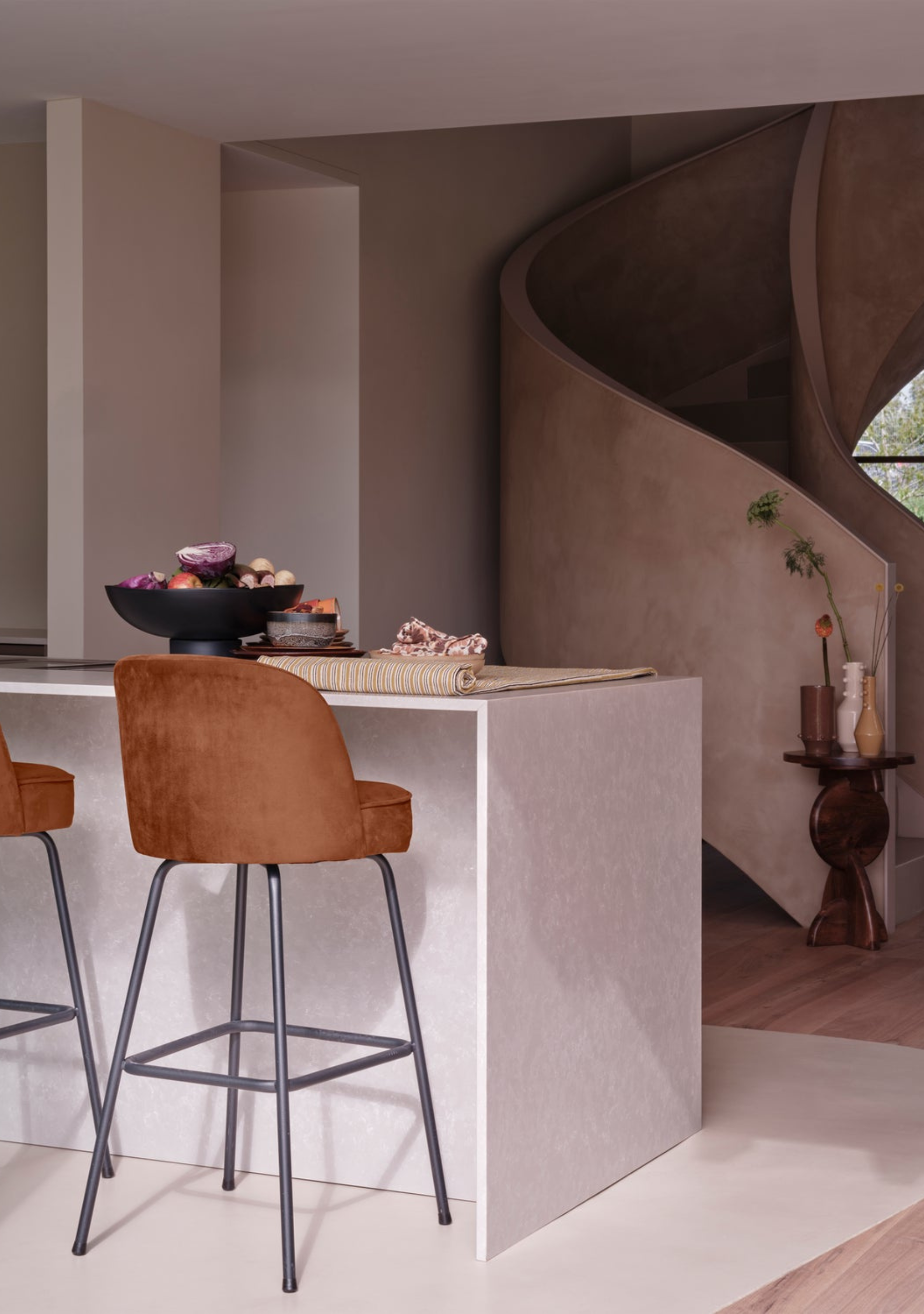 The Vogue Barstool in rust velvet adds warmth and modern refinement to any bar or kitchen counter. Its rounded seat and subtle sheen create a sense of understated luxury, while the matte black frame provides balance and durability. The design captures the essence of soft geometry — elegant, stable, and inviting.