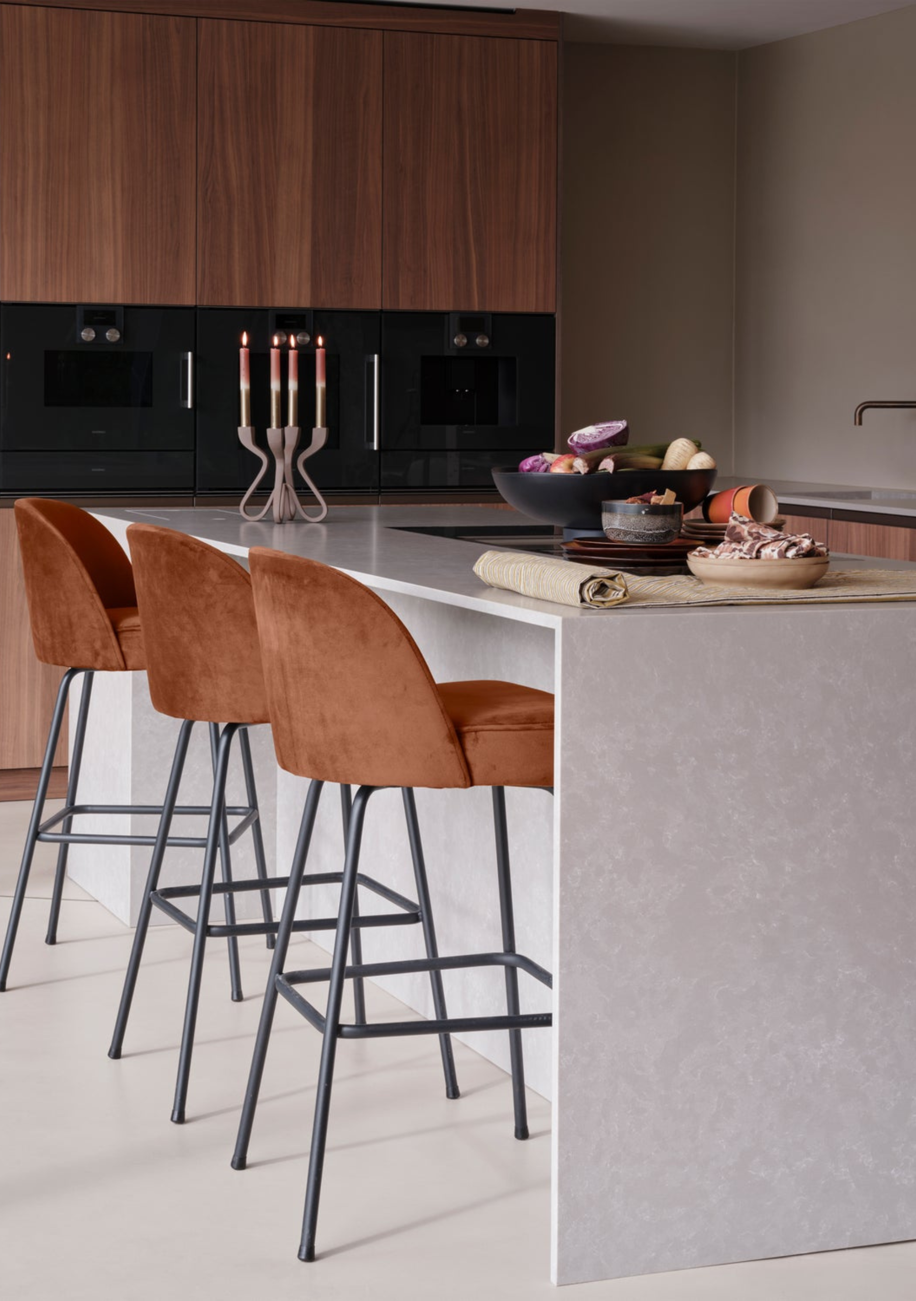 Velvet barstool 80 cm in rust tone. Soft seat, black steel legs, elegant comfort for kitchens and bars.