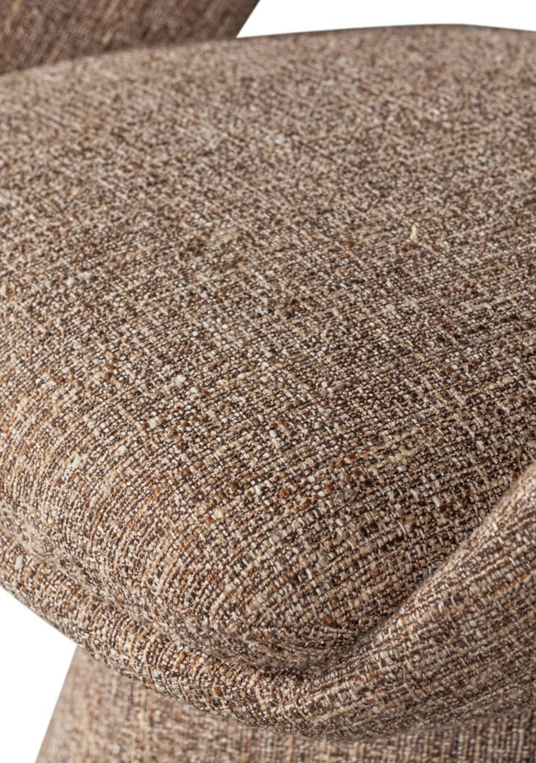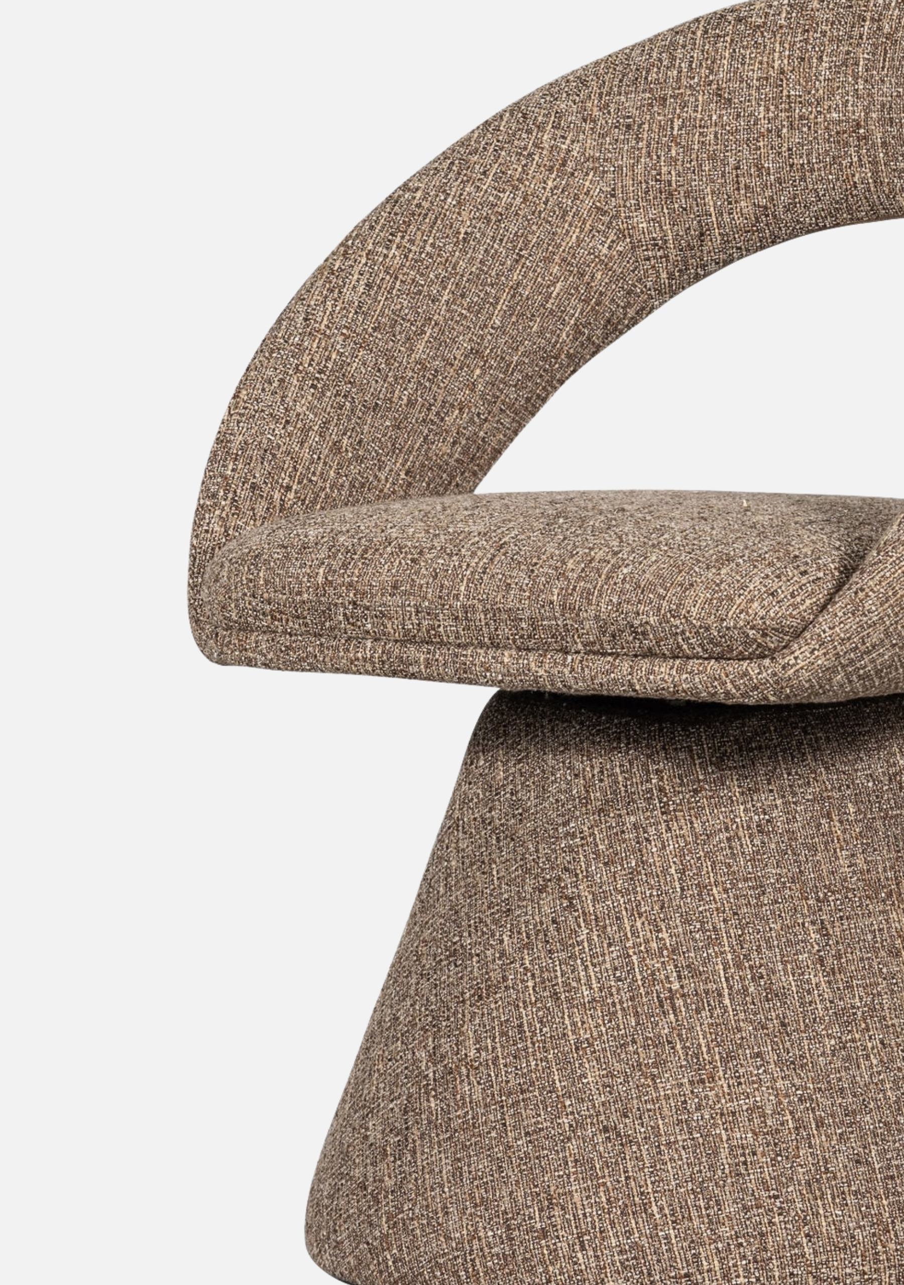 Elegant swivel dining chair in natural mélange fabric. Sculptural form, soft comfort, and timeless modernity.