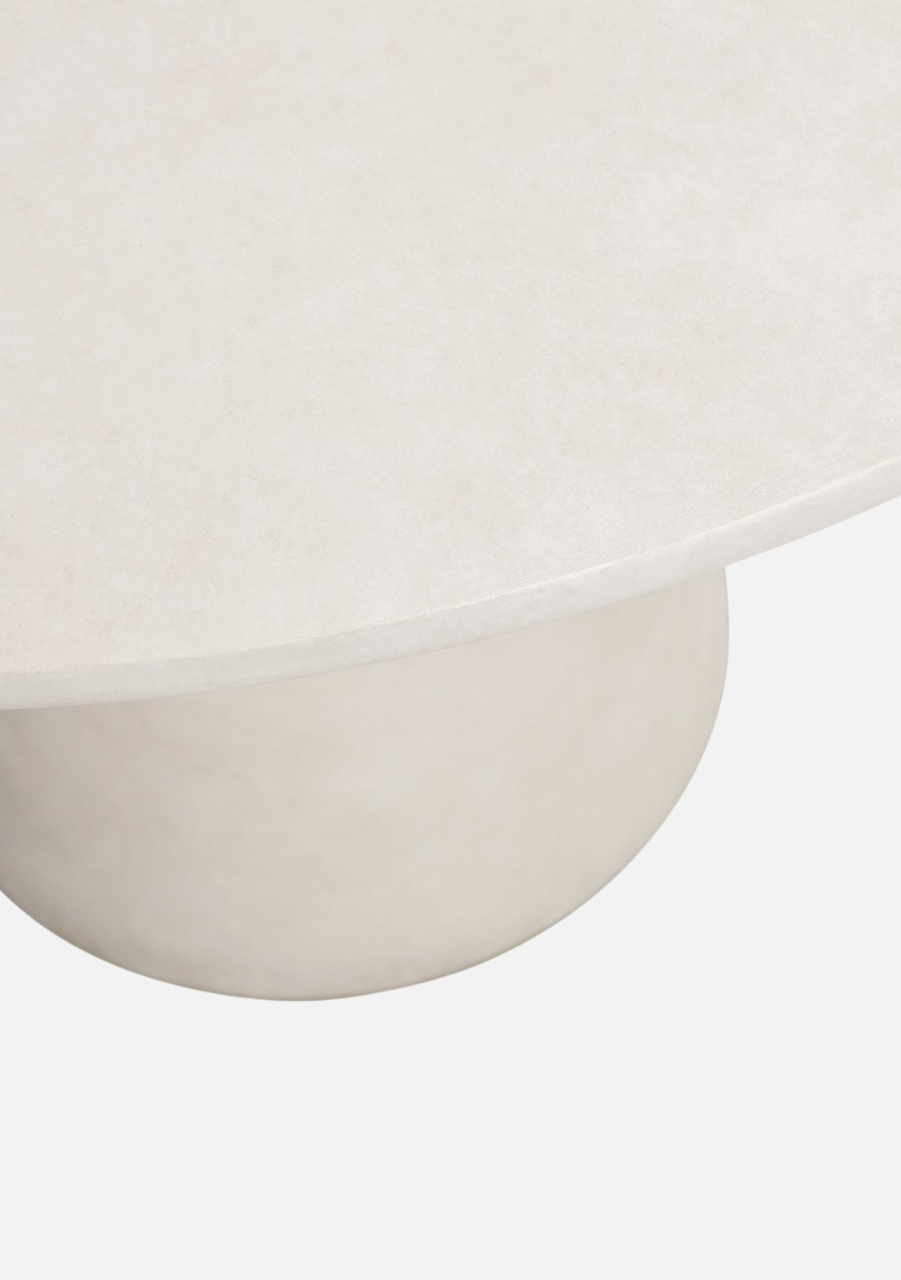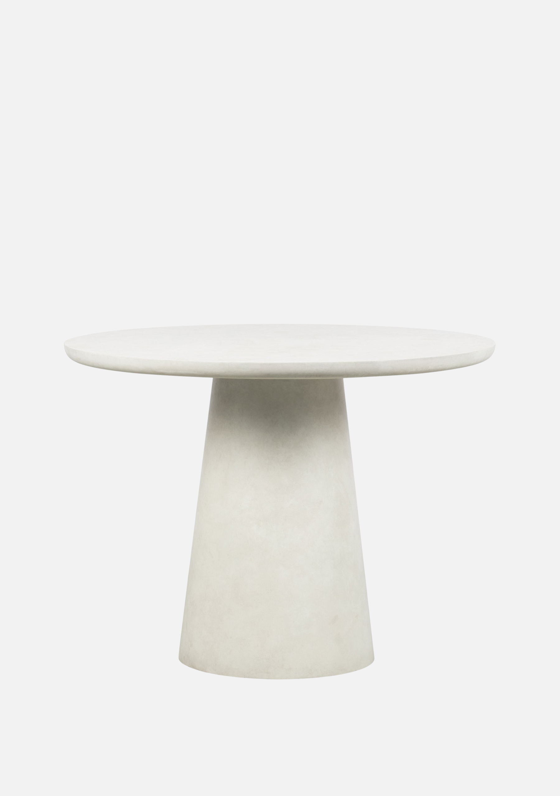 Crafted from fibre clay with a smooth white finish, its elegant round shape and conical base create a harmonious balance between solidity and lightness. Measuring 76 cm in height and 100 cm in diameter, Damon offers comfortable dining for four while maintaining a refined, airy presence.