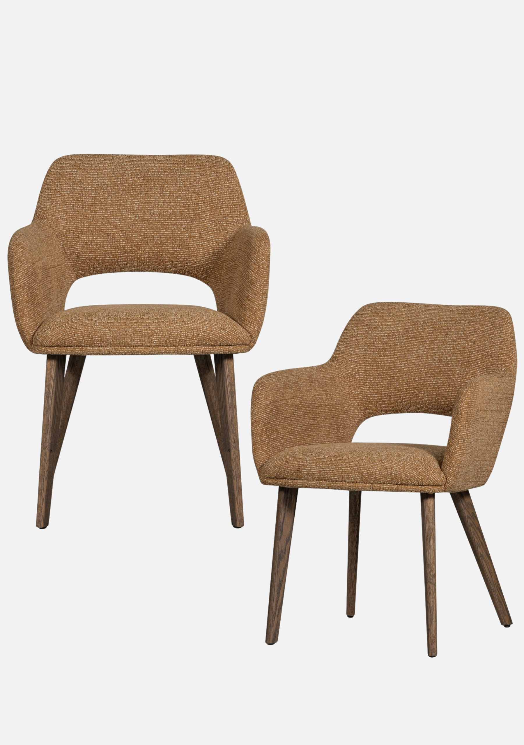 Set of 2 yellow chenille dining chairs with dark oak legs. Warm tone, tactile comfort, and timeless design.