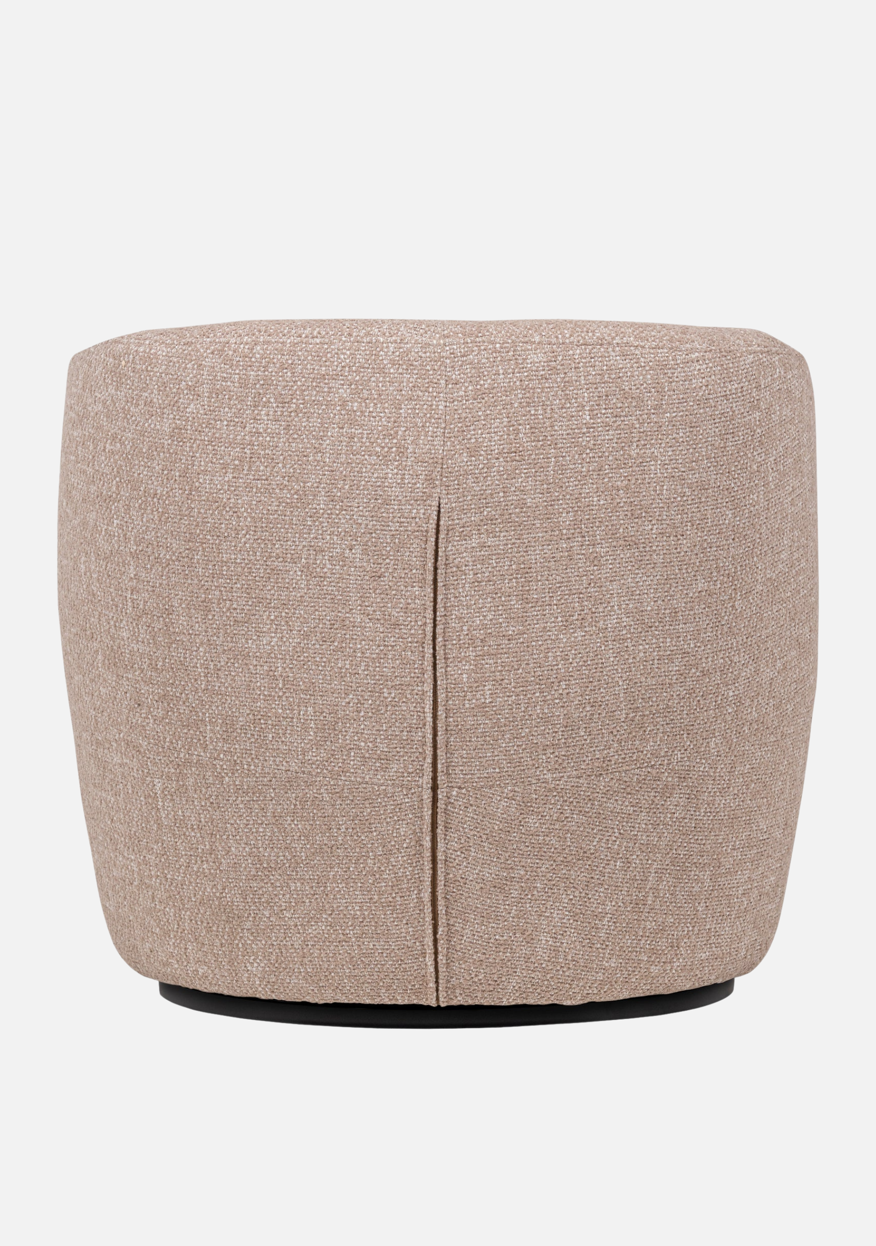 Swivel armchair in natural mélange fabric. Compact, soft, and sculptural with calm tones for modern interiors.