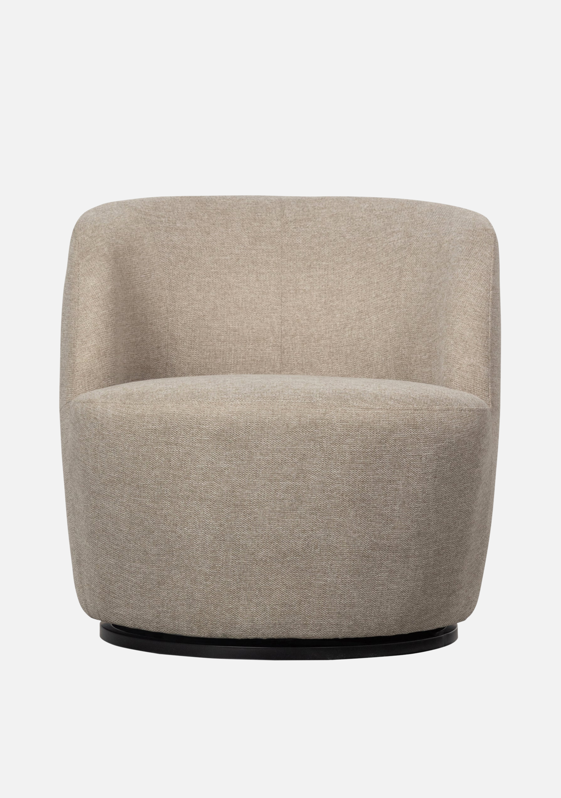 Swivel chair 68×70×77 cm in woven sand fabric. Soft, elegant and durable — perfect for modern interiors, hotels & lounges.