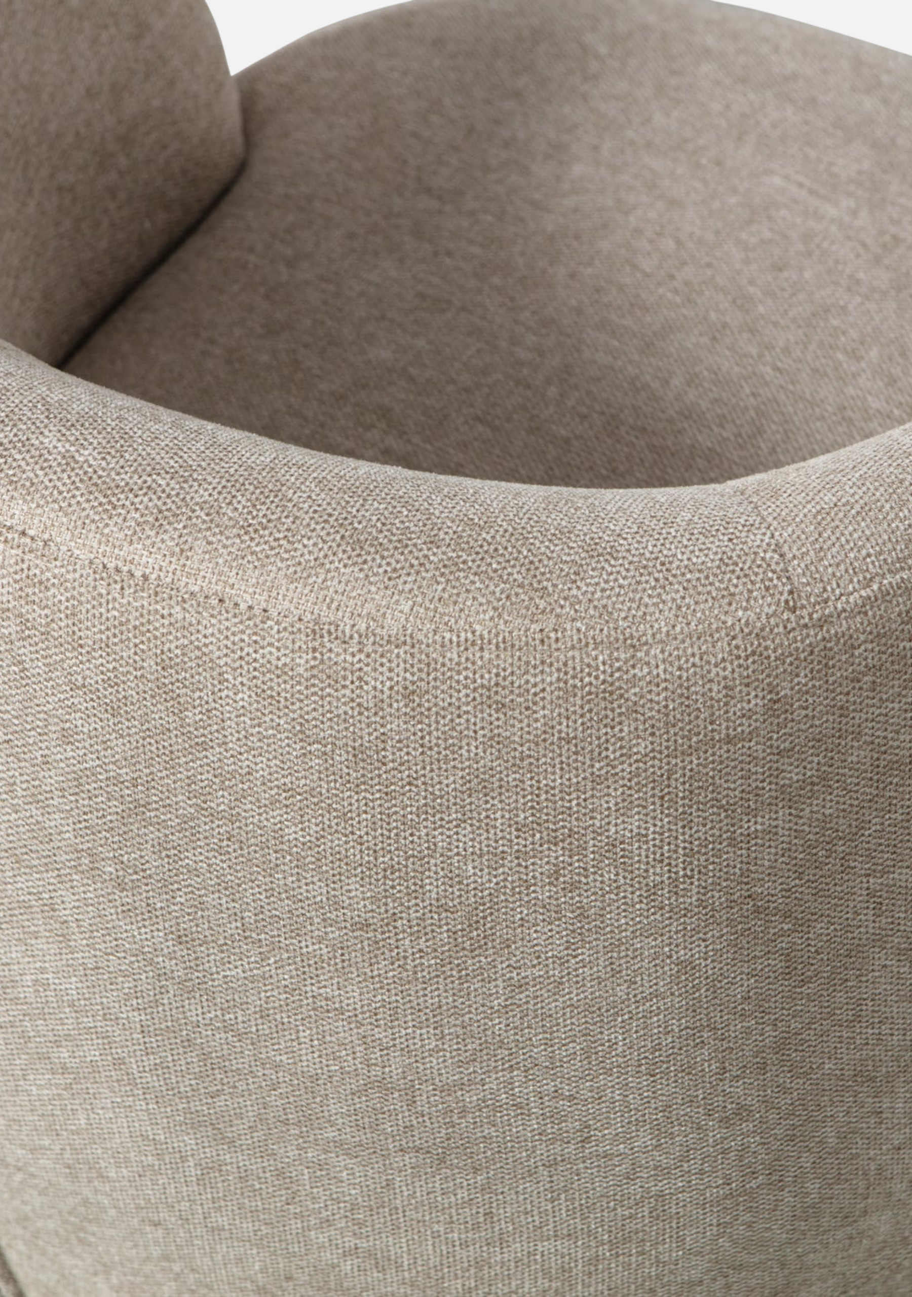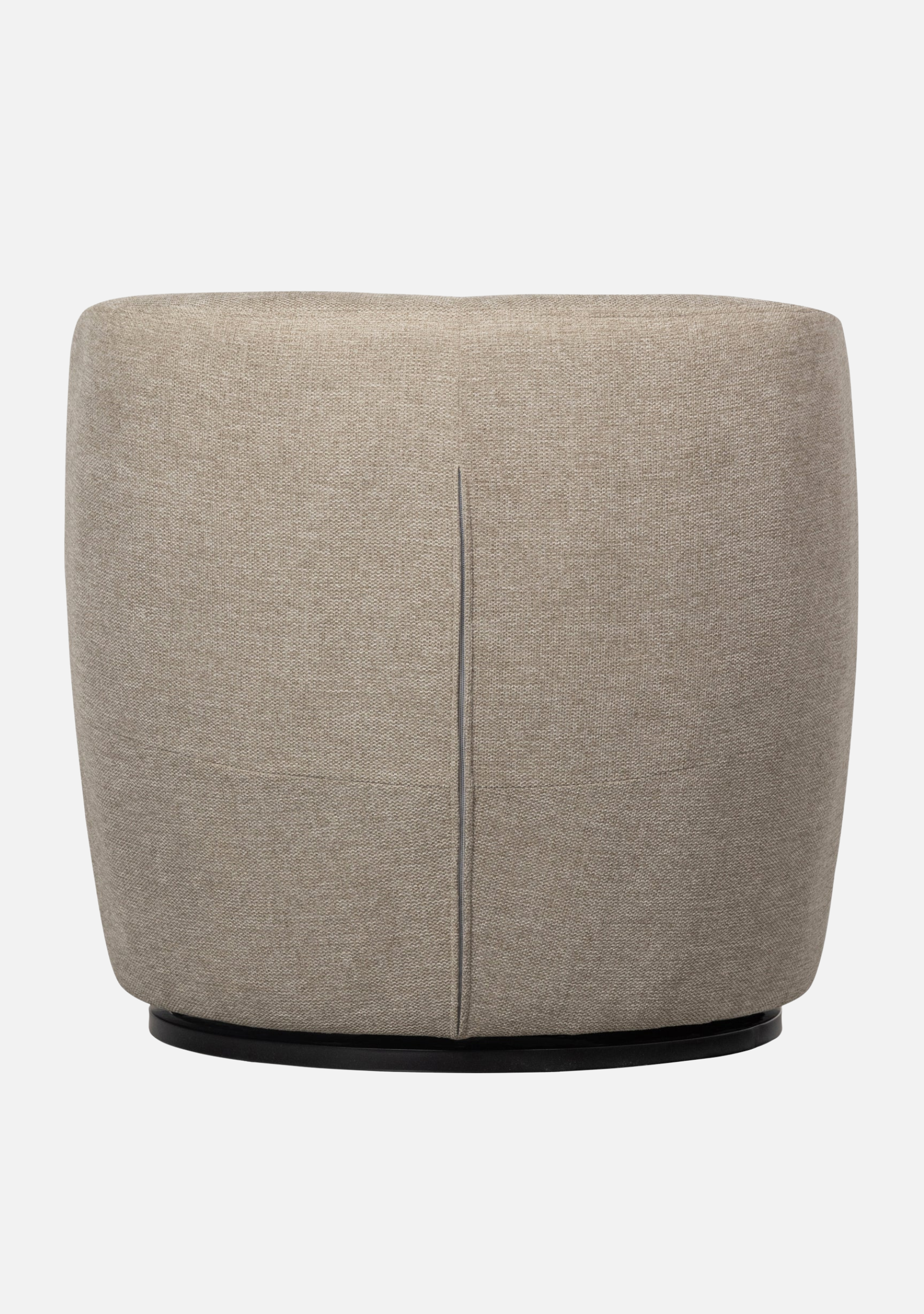 The Serra Swivel Chair in woven sand fabric embodies quiet luxury and modern comfort.