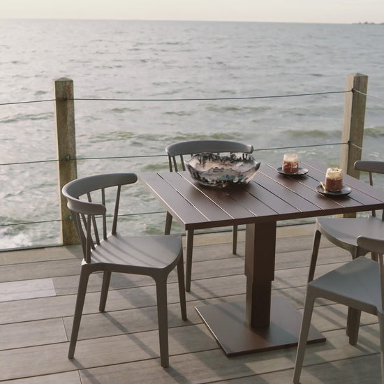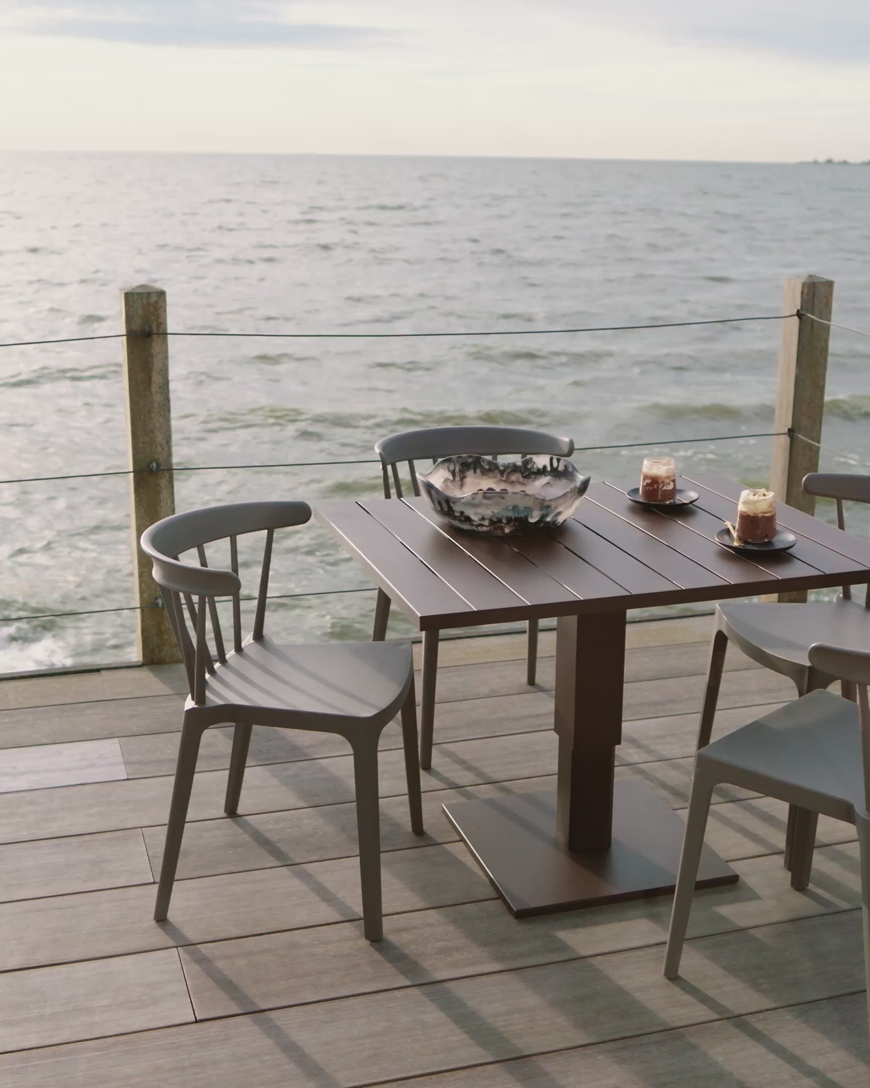 The soft sand-colored powder coating creates a natural and contemporary appearance that pairs beautifully with wood, textiles and outdoor lounge furniture. Its clean architectural silhouette allows the table to integrate effortlessly into modern outdoor environments.