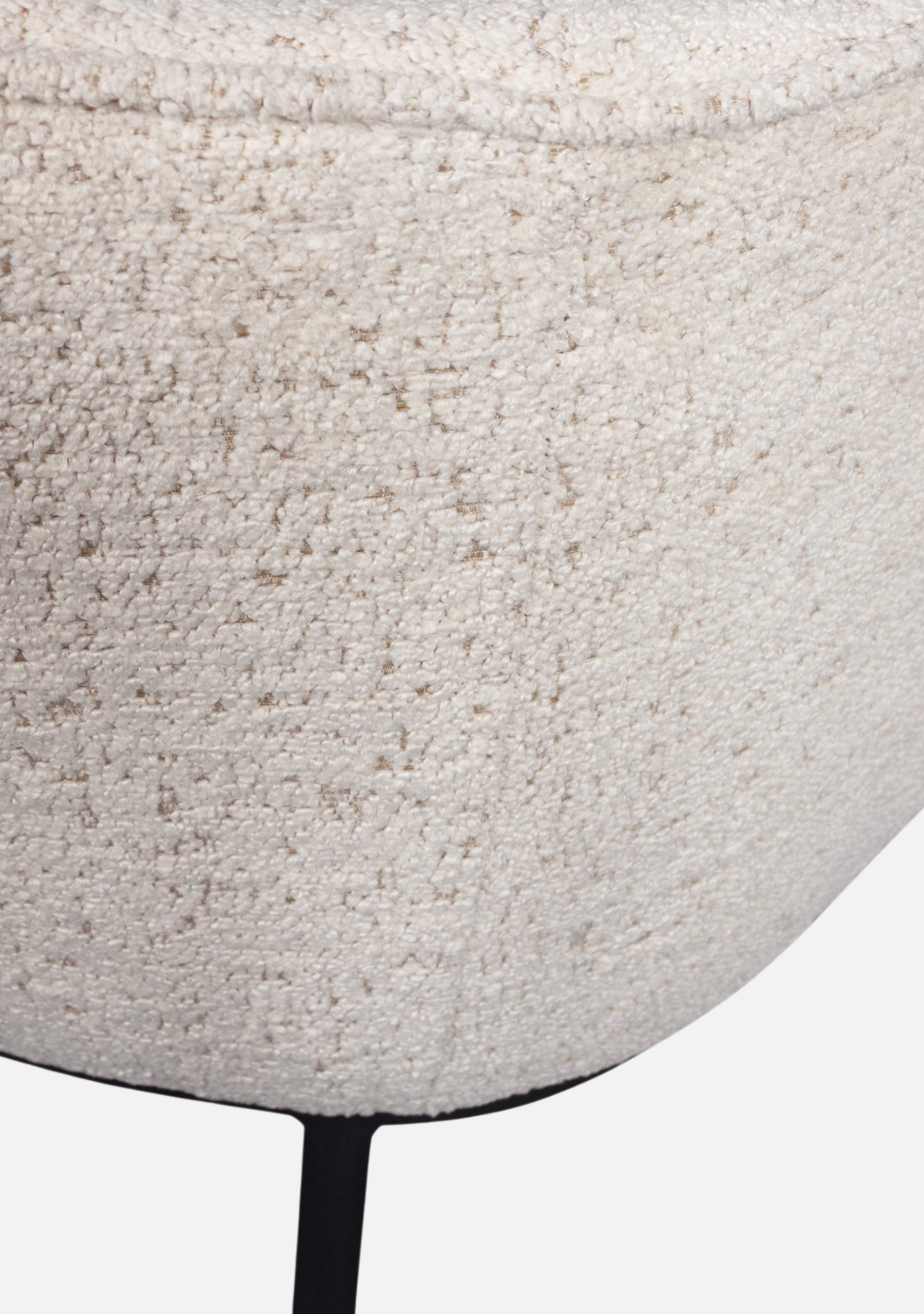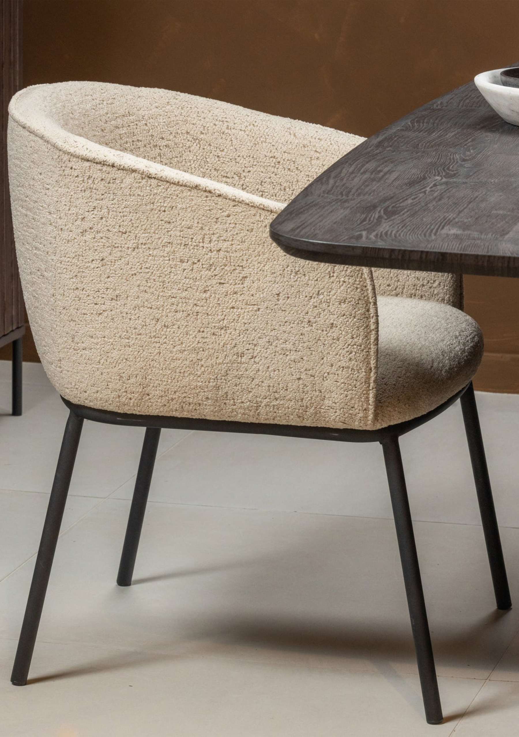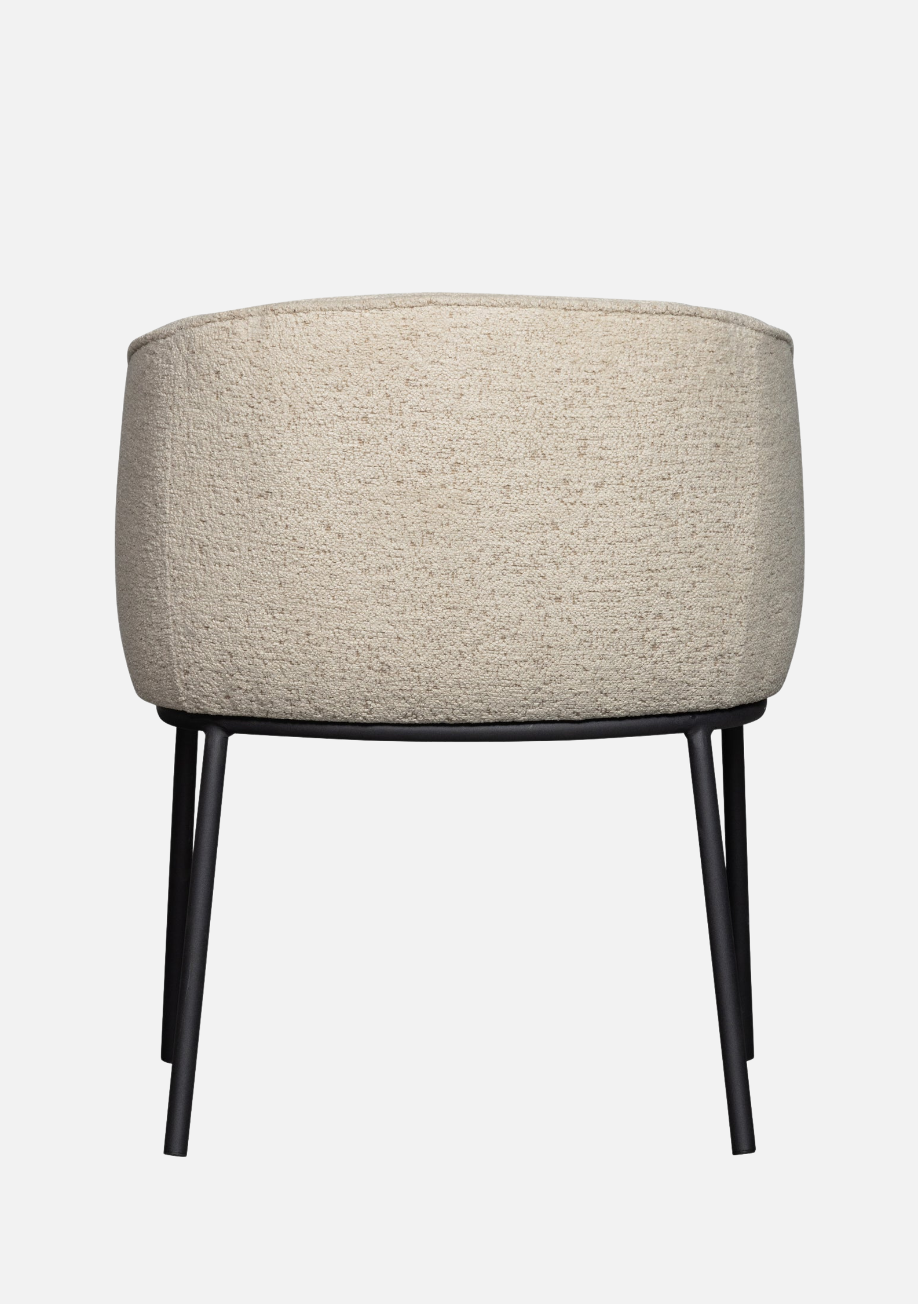 Dining chair in natural bouclé with metal legs. Soft texture, sculptural form, and timeless Scandinavian balance.
