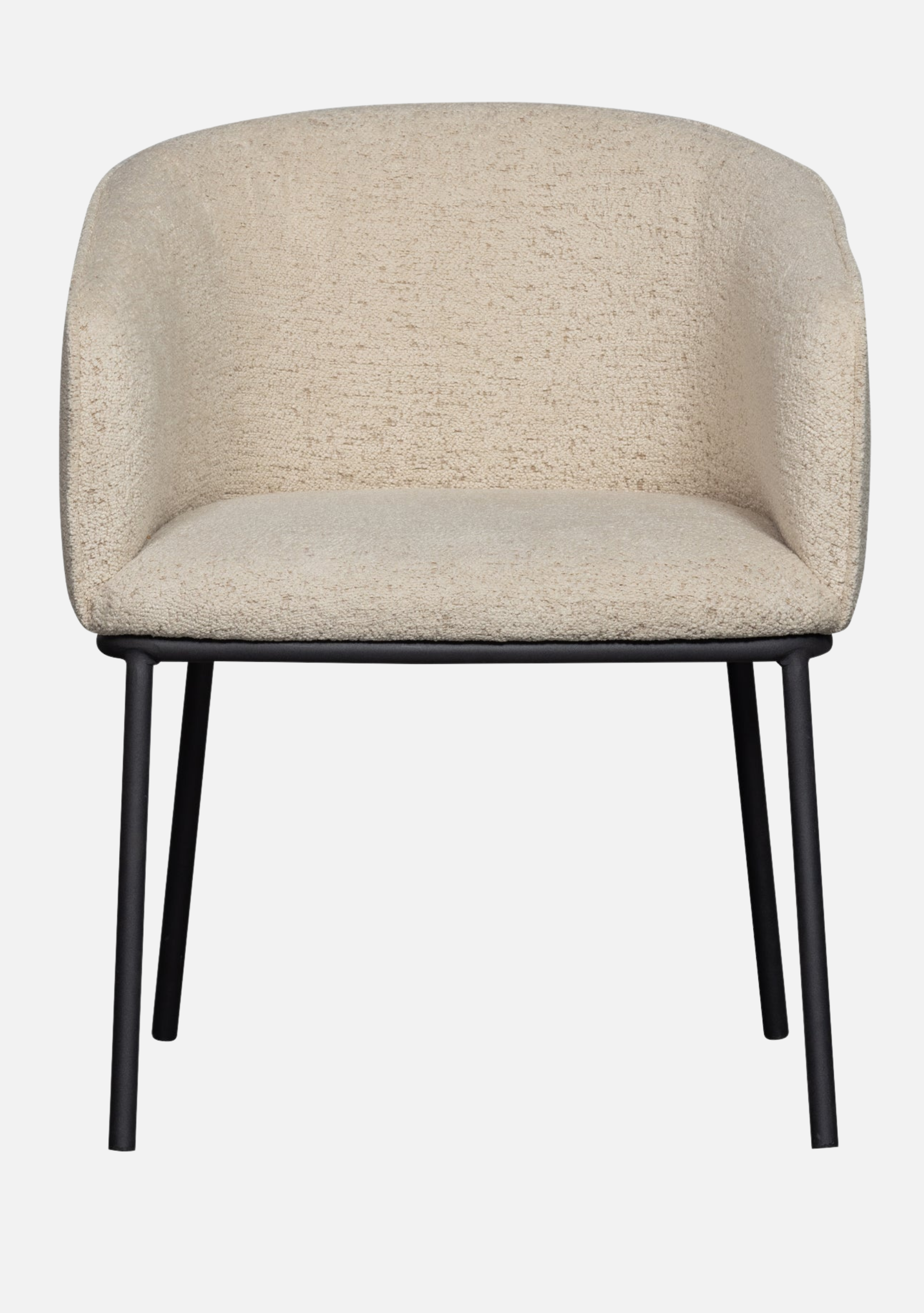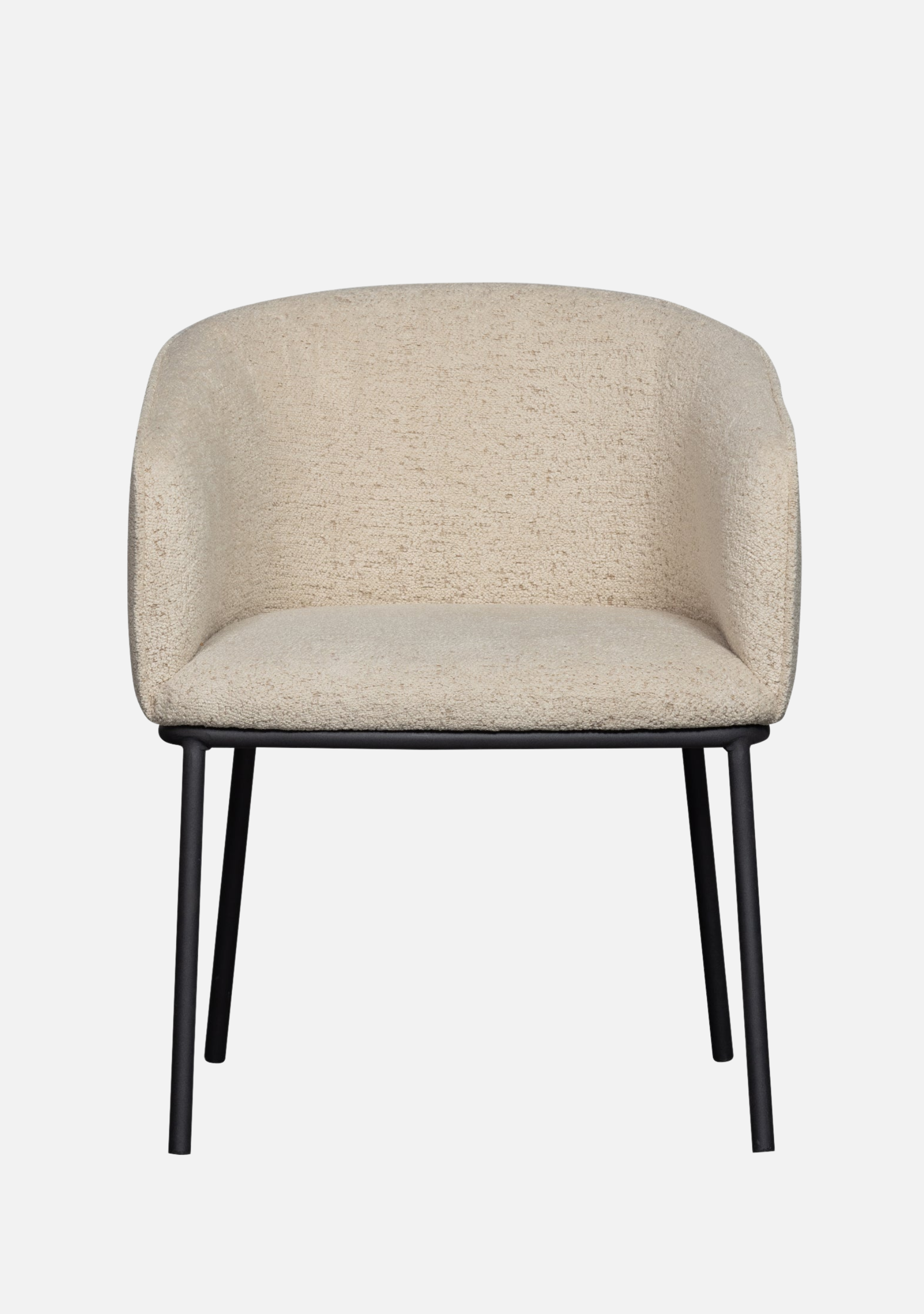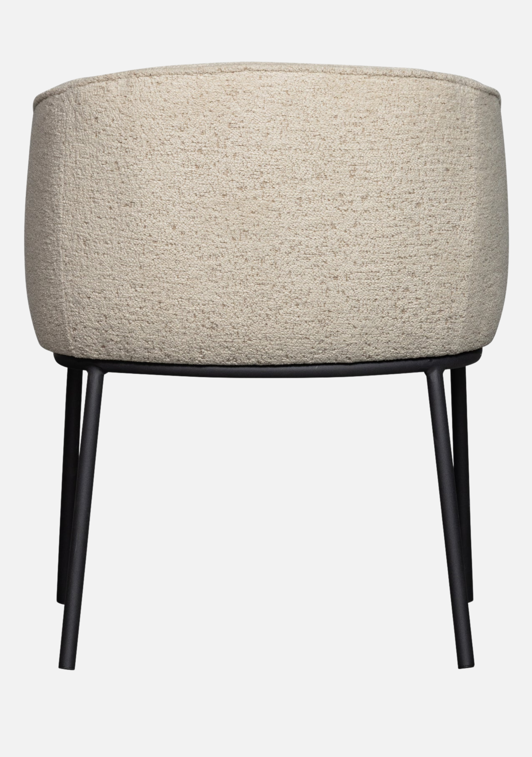 Dining chair in natural bouclé with metal legs. Soft texture, sculptural form, and timeless Scandinavian balance.
